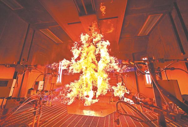 10月17日,在清华大学合肥公共安全研究院灾害环境人员安全安徽省重点实验室里,技术人员使用轰燃防护实验系统开展针对消防员灭火防护服整装的阻燃热防护性能检测。