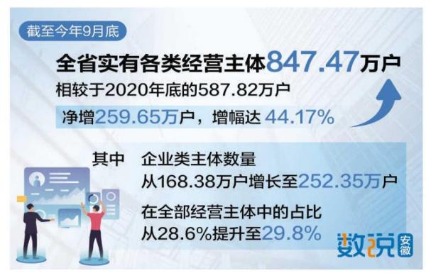 “一业一证一码”是我省商事制度改革持续深化的一个缩影。“十四五”以来,我省持续深化改革,降低制度性交易成本、激发市场活力,为全省经济高质量发展注入了强劲动力。截至今年9月底,全省实有各类经营主体达到847.47万户,相较于2020年底的587.82万户,净增259.65万户,增幅高达44.17%。其中,企业类主体数量从168.38万户增长至252.35万户,在全部经营主体中的占比从28.6%提升至29.8%。