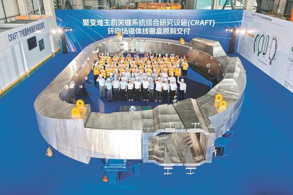 10月7日,在合肥聚变堆主机关键系统综合研究设施园区,中国科学院合肥物质科学研究院等离子体所为未来中国聚变工程示范堆(CFEDR)研制的1∶1原型件——环向场磁体线圈盒正式交付。该部件高21.5米,重400吨,是世界上最大的环向场磁体线圈盒。