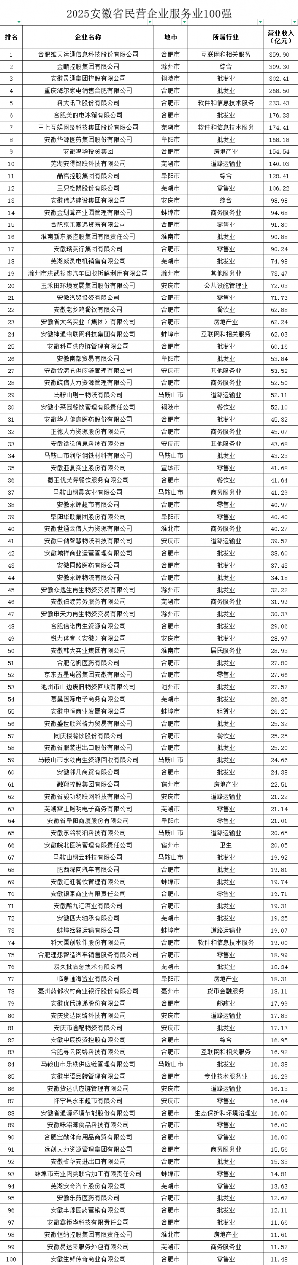 10月16日上午,2025安徽省民营企业百强发布会在合肥举行。会上发布了2025安徽省民营企业“营收百强”“制造业百强”“服务业百强”“吸纳就业百强”榜单。其中:
