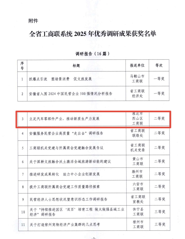 近日,烈山区工商联撰写的《立足汽车零部件产业,推动新质生产力发展》调研报告,在全省工商联系统2025年优秀调研成果评选中斩获二等奖,充分彰显了烈山区工商联调研工作的专业性、针对性和实效性。