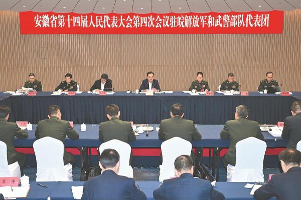 2月5日下午,省委书记梁言顺来到驻皖解放军和武警部队代表团,与代表们一起审议政府工作报告、审查“十五五”规划纲要草案。