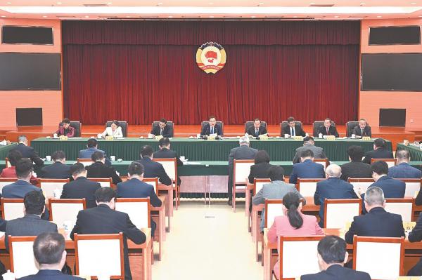 二月五日下午,省长王清宪来到省政协十三届四次会议民革、民建、经济界联组会议会场,听取意见建议。