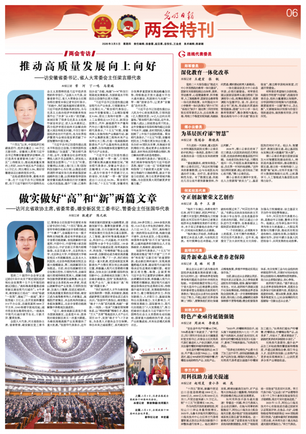 “习近平总书记创造性提出以人民为中心的发展思想,引领我国1亿人摆脱贫困、14亿人迈向共同富裕。”梁言顺代表介绍说,近年来,安徽八成以上财政资金用于民生,去年安徽城乡低保标准均超过全国平均水平,城镇、农村居民收入增速扭转了上年低于全国的局面。梁言顺代表表示,“十五五”时期,安徽将把民生工作摆在更加突出位置,扎实办好30项民生实事,实施城乡居民增收计划,推动更多公共服务向基层、农村和生活困难群众倾斜,努力解决好群众的急难愁盼。