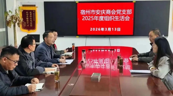2026年3月13日上午,宿州市安庆商会党支部组织召开2025年度组织生活会暨民主评议党员大会。凤池社区党委副书记谢立伟到会指导,商会党支部书记徐杰焰主持会议,全体党员参加。