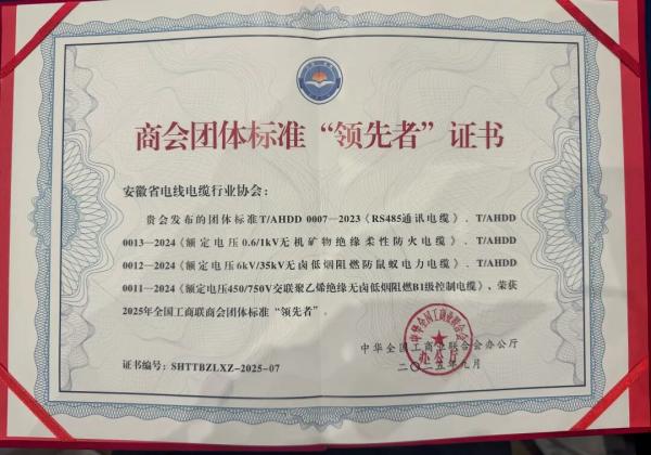 9月26日上午,在陕西西安召开的2025民营经济创新发展大会暨知名民企助力陕西高质量发展大会上,正式揭晓2025全国工商联商会团体标准相关评选结果,由安徽省电线电缆行业协会发布的团体标准T/AHDD 0007—2023《RS485通讯电缆》、T/AHDD 0013—2024《额定电压0.6/1kV无机矿物绝缘柔性防火电缆》、T/AHDD 0012—2024《额定电压6kV/35kV无卤低烟阻燃防鼠蚁电力电缆》、T/AHDD 0011—2024《额定电压450/750V交联聚乙烯绝缘无卤低烟阻燃B1级控制电缆》,荣获2025年全国工商联商会团体标准“领先者”。